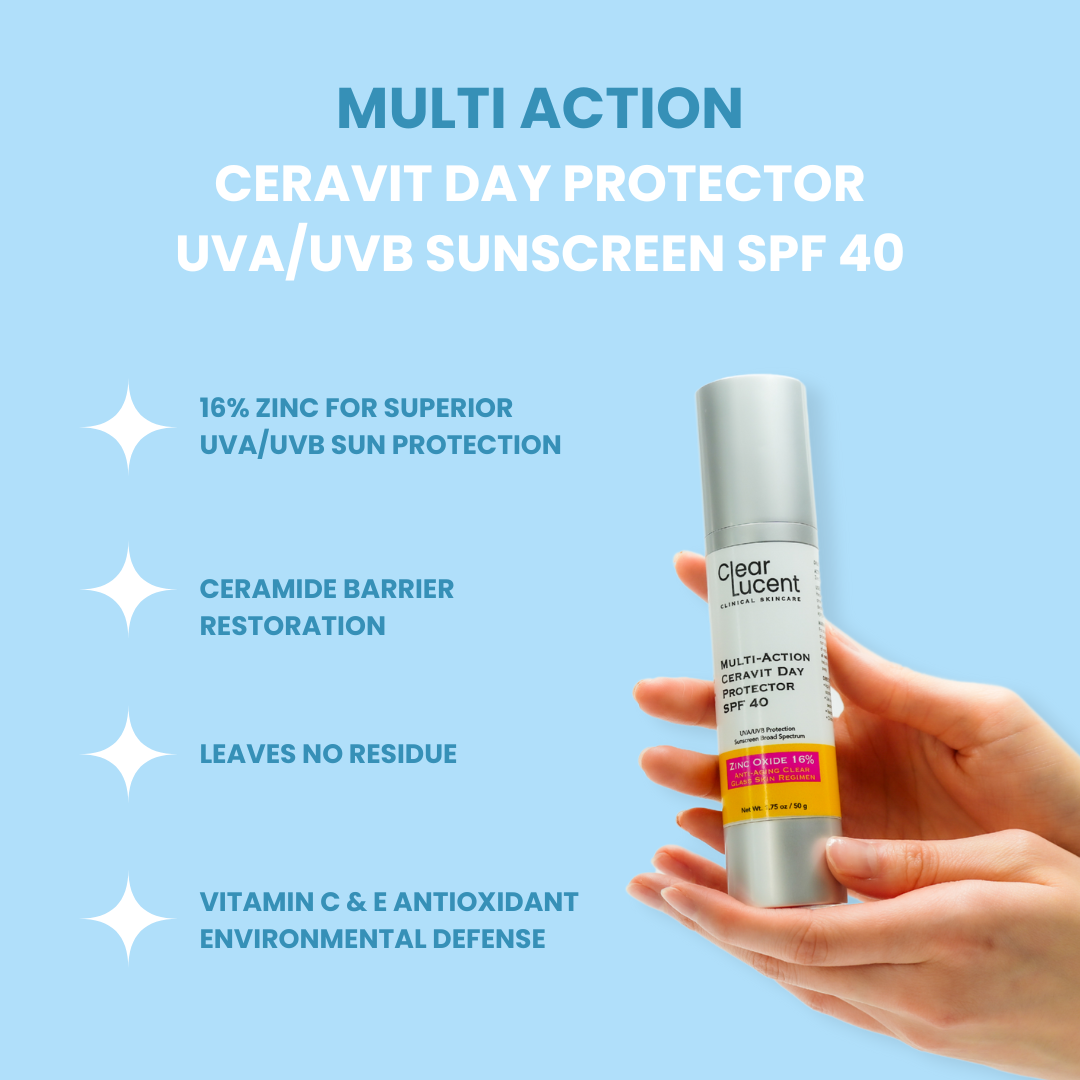 Experience the power of zinc sunscreen with ClearLucent Multi-Action CeraVit Day Protector Sunscreen SPF 40. Protect, nourish, and reveal radiant, healthy skin every day.